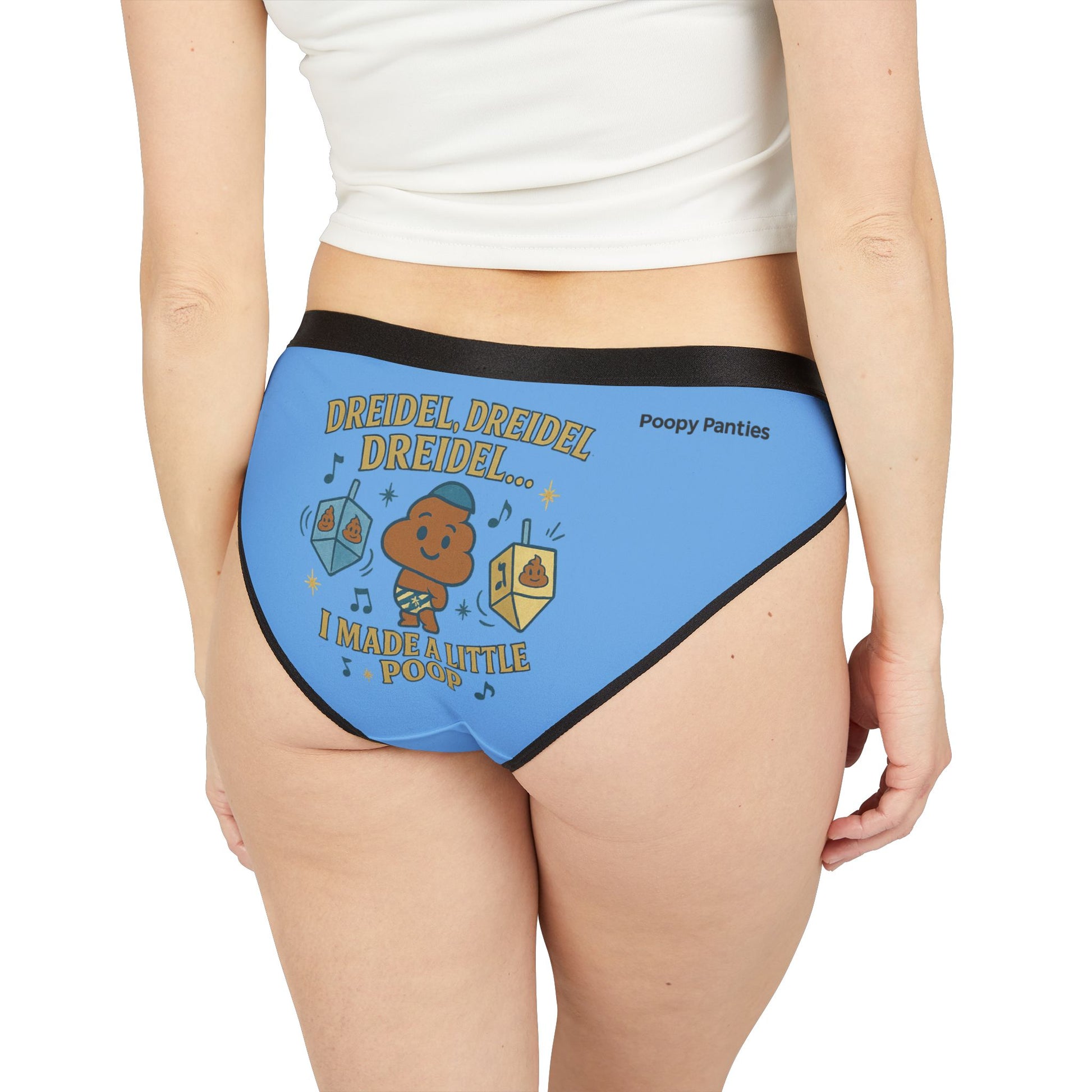 These limited-edition festive panties feature a vintage-style design with spinning dreidels, musical notes, and an adorable poop emoji wearing a yarmulke — all in a warm blue-and-gold color palette inspired by the Festival of Lights.